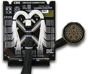 Mating connectors may come either as cable-mounted connectors as you see here, or bulkhead connectors which would mount directly to the CB8. If a mating connector is available either way, then the method used depends on the customer's test process. While a bulkhead connector mounted directly to the board produces a more compact interface, it may not be appropriate if the test cable consists of heavy-gauge wire or is bulky. Heavy or bulky test cables can apply unreasonable force to the board or tester when attached, or even pull the tester off the workbench.