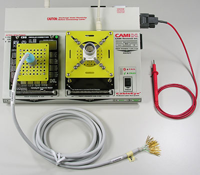 Once the AutoBuild™ Guided Assembly Software (catalog Item 728) is started, the operator touches the red probe to a loose pin, and the target cavity begins flashing in the build connector. The operator then inserts the pin with a special tool, and presses the black button on the tester to advance to confirm insertion.