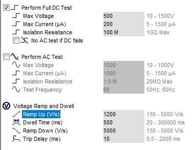 Automatic high voltage test equipment will apply DC voltage to one conductor while all other conductors remain at zero volts. Normally for each wire, the voltage ramps up gradually, holds for the “dwell time”, and ramps down once the test on that wire finishes. This process repeats for each conductor in the cable, so for example, a five-conductor cable, the upramp-dwell-downramp cycle would repeat five times, each time on a successive wire. Through this process, a wire’s insulation is actually tested twice, once when the wire itself receives the high voltage (+ to – polarity across the wire’s insulation), and once when the same wire remains a zero volts while another wire receive voltage later in the test (– to + polarity on the first wire).