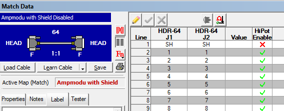 In the CableEye® tester manufactured by CAMI Research, any conductor may have high voltage suppressed during test by simply denoting this in a “HiPot Enable” column. In this screen shot (Fig. 2), we show how to suppress high voltage being applied to the shield: