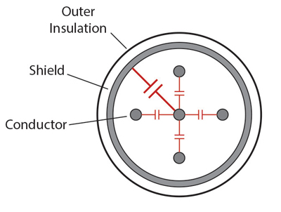 With increased capacitance, the energy stored by a charged shield also increases to levels that may be hazardous to the operator, and may damage the cable’s insulation due to arc heating should an insulation breakdown occur. Note that energy stored in a capacitor increases directly with the capacitance, and with the square of the voltage: