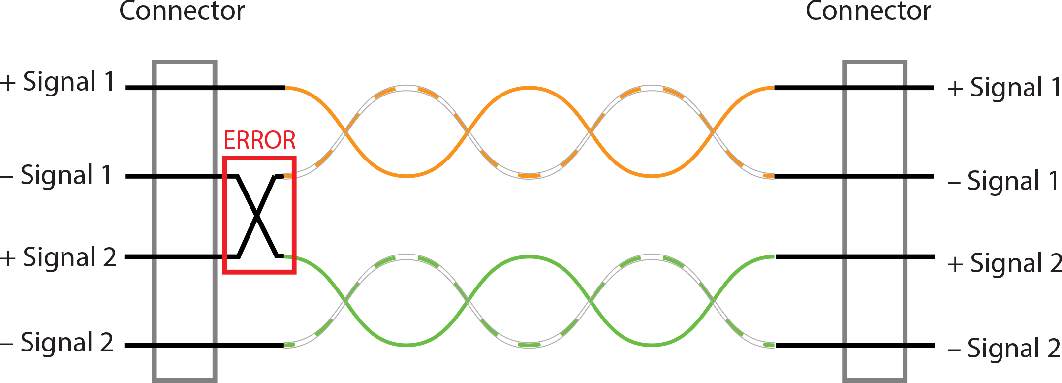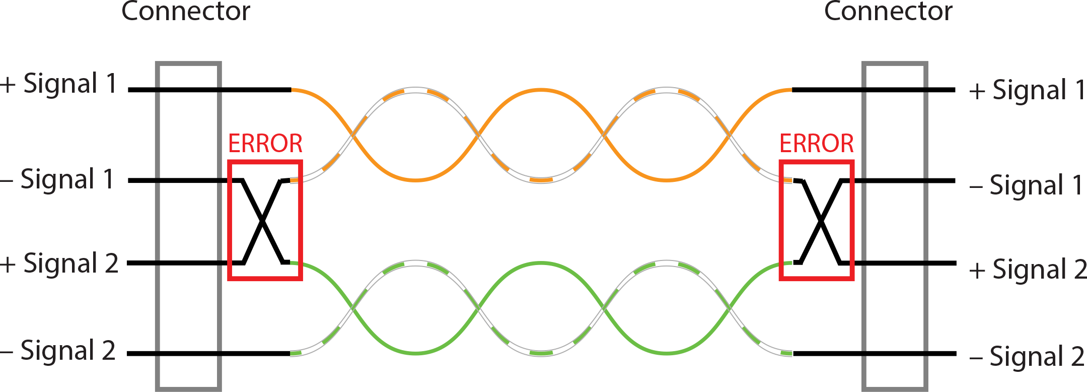 Typically, an Ethernet cable contains four pairs and should be wired +Signal1/-Signal1, +Signal2/- Signal2, etc. If, through miswiring, we have two pairs in the cable wired +Signal1/+Signal2 and - Signal1/-Signal2, the cable will be faulty and unusable.