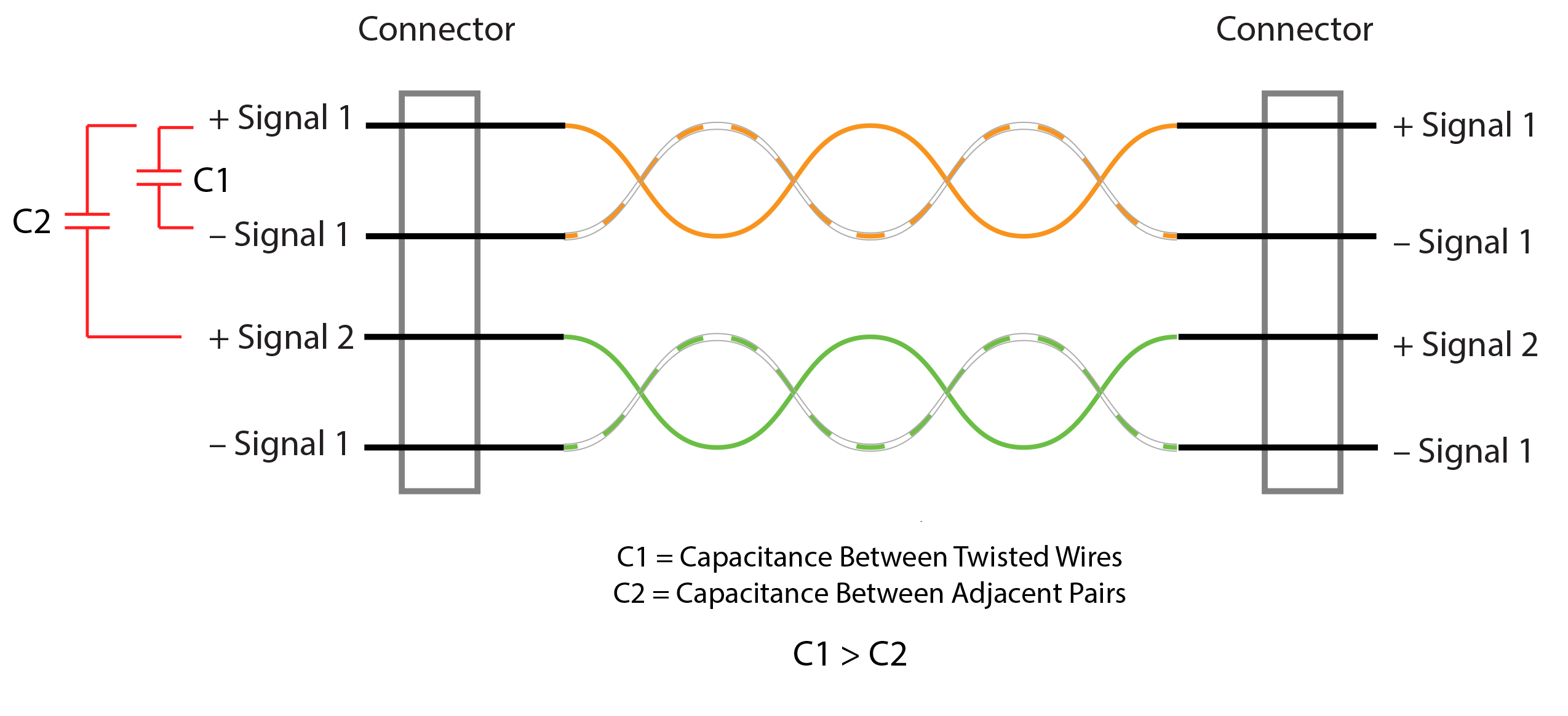 In one twisted pair, the two wires involved come much closer to each other (two insulation thicknesses) than they do to adjacent pairs. As a result, the capacitance of a twisted pair would be expected to be higher than the capacitance between other wires in the cable (Fig. 1), and with this information, we can determine the necessary relationship.