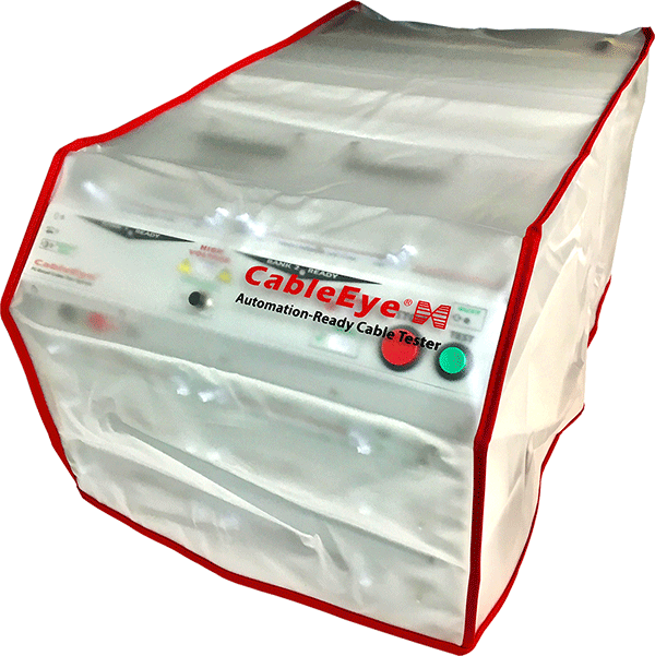 Antistatic, water-resistant, dust cover in frosty clear taffeta vinyl with red trim. A cover for every stack height.