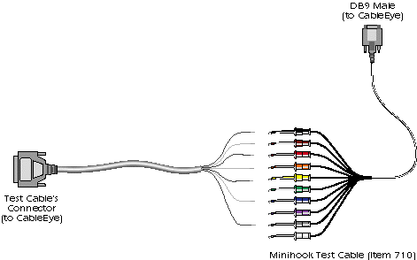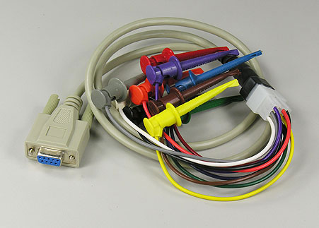 Ten minihook test clips attach to the CableEye tester and let you check for pin number terminations on the connectorized end of a cable (as shown on the below), or probe arbitrary wiring networks. When two minihook cables are used, you may check continuity across backplanes and PC boards as well. The DB9 connector attaches to the DB9 male socket on CB15.