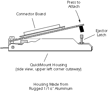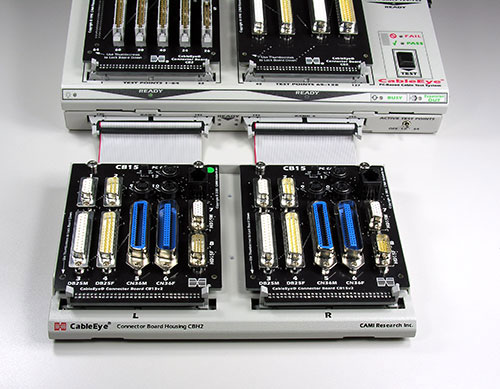 The first image shows the QuickMount housing (Item 712H) with two CB15 boards (Item 745. Not included) attached to an Expansion Module. This configuration works with any CableEye tester expansion module. In the second image, you see how to attach the connector boards to the housing. The third image shows an array of QuickMount housings connected to a large system with many expansion modules.
