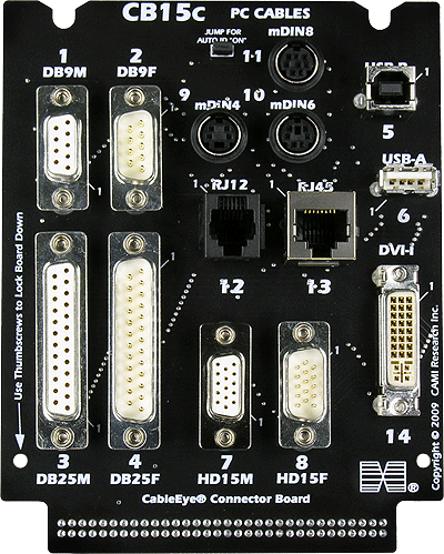 Includes 14 standard connectors commonly found on computers and peripheral devices: DB9 male and female (serial port), DB25 male and female (serial port, printer port), high-density HD15 male and female (analog monitors), DVI female (digital monitors), USB-A and USB-B, miniDIN4, miniDIN6, and miniDIN8 (for male cable, used with older mice, keyboards, and printers), RJ12 (6-position 6-conductor, used with modem and telephone), RJ45 (8-position 8-conductor, used with ethernet cables). MiniDIN sockets may be configured for 5- and 7-pin miniDIN sizes on special order.