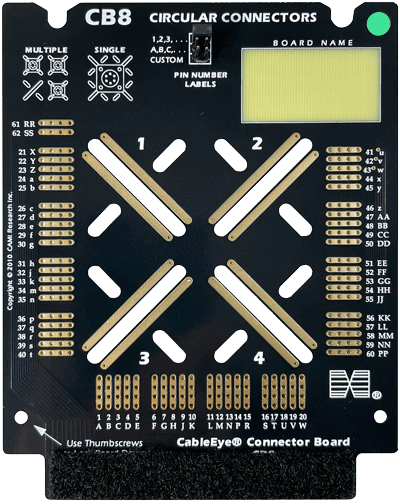 When the wiring is displayed, a generic dual-row header is shown, and a jumper setting on the board determines whether lettered or numbered pin labels are used. Use the optional PinMap™ fixture editor software (recommended for this board) to choose a better, connector-specific graphic from the CableEye connector library, and to assign custom pin labels. To create a graphic not yet in the connector library, use the Connector Designer ™ connector editor software.