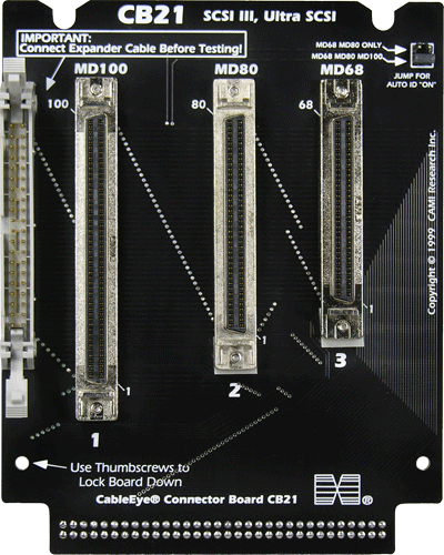 Three miniD-style connectors in sizes of 68 pins, 80 pins, and 100 pins permit testing of fast-wide SCSI cables or other types using these connectors. Requires 256 test points! Bare board available for other large-format connectors that fit the 4-row staggered-pin footprint of these connectors; contact us for details and pricing for the bare board version.