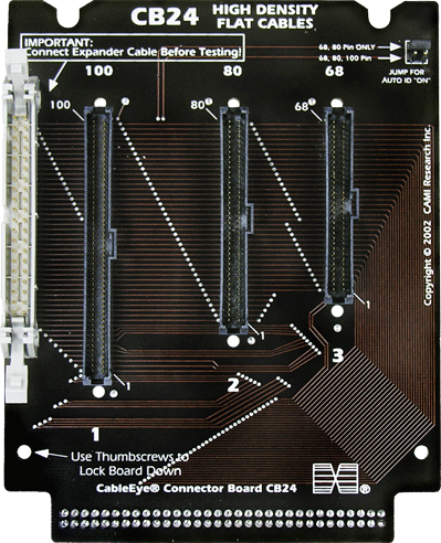 Use CB24 to test high-density flat cables with IDC wiremount sockets (0.025" wire centers, 0.050x0.100" pin centers). Four-wall headers for 100-pin, 80-pin, and 68-pin cables are provided on each board. Bare board available for other large-format connectors that fit the 2-row footprint of these connectors; contact us for details and pricing for the bare board version. Requires 256 test points.