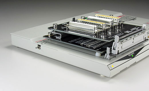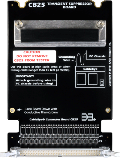 If using an M3U-series tester, use CB25 when regularly testing cables longer than 10 ft (3m), when testing cables with a large surface area shield or conductor, or when working in a high static environment to guard your M3U tester against damage from electrostatic discharge. On each board, 64 transient suppressor diodes especially designed for fast switching divert any overvoltages to ground before damage to tester electronics can occur. The CB25 mounts to the the control module tester like any CB board and is physically secured with supplied stainless steel thumbscrews. Attach your test CB boards directly to CB25 as shown in the 2nd photo below. Required for CableEye M3U series models only. Use CB25s on the control module, and the CB25X variant (Item 755X) on expansion modules.