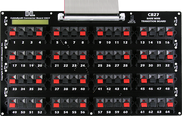 CB27 employs 16 quad Pushpin blocks to provide an interface for cables or harnesses that terminate in bare wires. Up to 64 wires can be accommodated per board. While similar to screw terminals, the Pushpin blocks use spring-loaded levers that open easily with finger pressure and, when released, clamp down on a bare wire to hold it firmly in place. This provides very fast attachment and removal of bare wire connections. For longer-term set-ups, holes along the sides allow the use of wire ties to control wire bundles that exit from either side. Each 6.4x10.9" board, made using rugged 0.93" thick fiberglass, includes rubber feet for tabletop use. Corner holes allow the boards to be stacked or screwed down to a fixed surface. Includes an 8" long 64-conductor extension cable for direct connection to the tester. Custom cable lengths possible with special order. 0.1" Pushpin opening will easily accept wires up to 18 gauge or one prong of a lug.