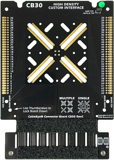 When the wiring is displayed, a generic dual-row header is shown for the connector. Use the optional PinMap™ fixture editor software (recommended for this board) to choose a better, connector-specific graphic from the CableEye connector library, and to assign custom pin labels. To create a graphic not yet in the connector library, use the Connector Designer ™ connector editor software. Use two CB30 boards together, or a CB30 in combination with any other CB board to accept any connector combination. Review the photos below for the setup options, or click to see photos of custom CB30 applications. Requires 256 test points.
