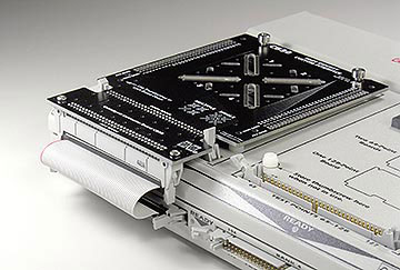 This generic board, similar in design to the CB8, accepts a wide range of circular connectors, rectangular connectors, bracket-mounted assemblies, adapter cables, and LIF test blocks. Mount your connectors using supplied standoffs and screws (see Photo 6 below). Any panel-mount circular connector with four mounting holes fits the "X" pattern slots on this board. Mount up to four small circular connectors (mounting hole spacing less than 0.9"), or one large connector (mounting hole spacing less than 2.3"). Wire pins from the attached connector to labeled pads surrounding the board. Use the numerous small holes around the board for nylon lacing to hold wiring in place. Alternatively, mount dual-row headers of up to 64-pins to the right and left pad footprints, spaced on a 0.1" grid (see Photo 3 below). Use these headers for a custom-designed daughter board that plugs into the CB30 (see Photos 4 and 5 below and CB30A through CB30G) or for flat cables. Instead of a single 64-pin header, attach combinations of smaller headers that have a 0.1x0.1" footprint. A total of up to 128 test points can be accommodated per board.
