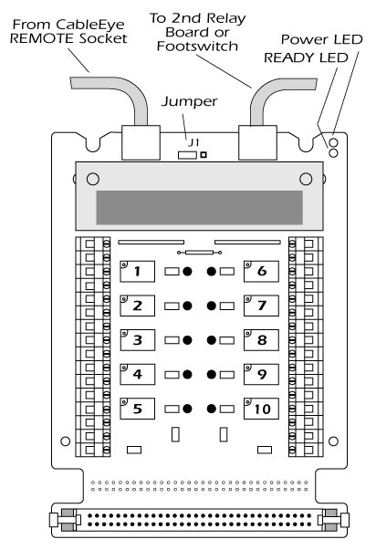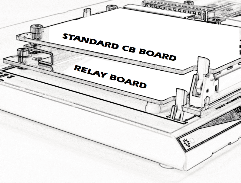 The relay board includes a small cable that connects the board to the Remote Control socket on the back of the machine; this provides power and control signals from the tester. The board uses no test points. Nonetheless, it can be attached to either Bank 1 or Bank 2 by plugging directly into the control module's 64-pin header. Special brackets allow a standard CB board to be mounted above the relay board/s to operate in the normal manner using all 64 pins in that bank position (see drawing below). Relay boards can be stacked in all but the M2U.