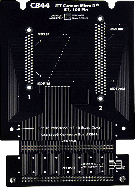Like the CB41 and CB42 boards, the CB44 provides connector footprints for Micro D connectors, with the following difference in design: Each board offers one position only for each size, and each board should be populated with either all male or all female connectors. You may either install male connectors on one board and female on the other, or all one gender on both boards. A jumper on the board configures the board for the proper gender. The CB44 offers a footprint for a 100-pin connector, requiring a 256-point tester.