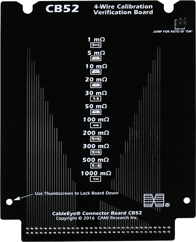 Sold as a SINGLE board, the CB52 contains a series of eleven precision low-value resistors for checking against the system’s calibrated values. The precision resistor values span a significant enough range to provide complete confidence of valid calibration. We recommend verification once a quarter.