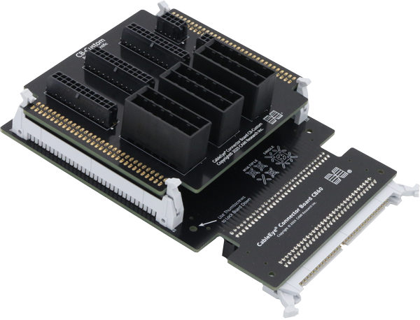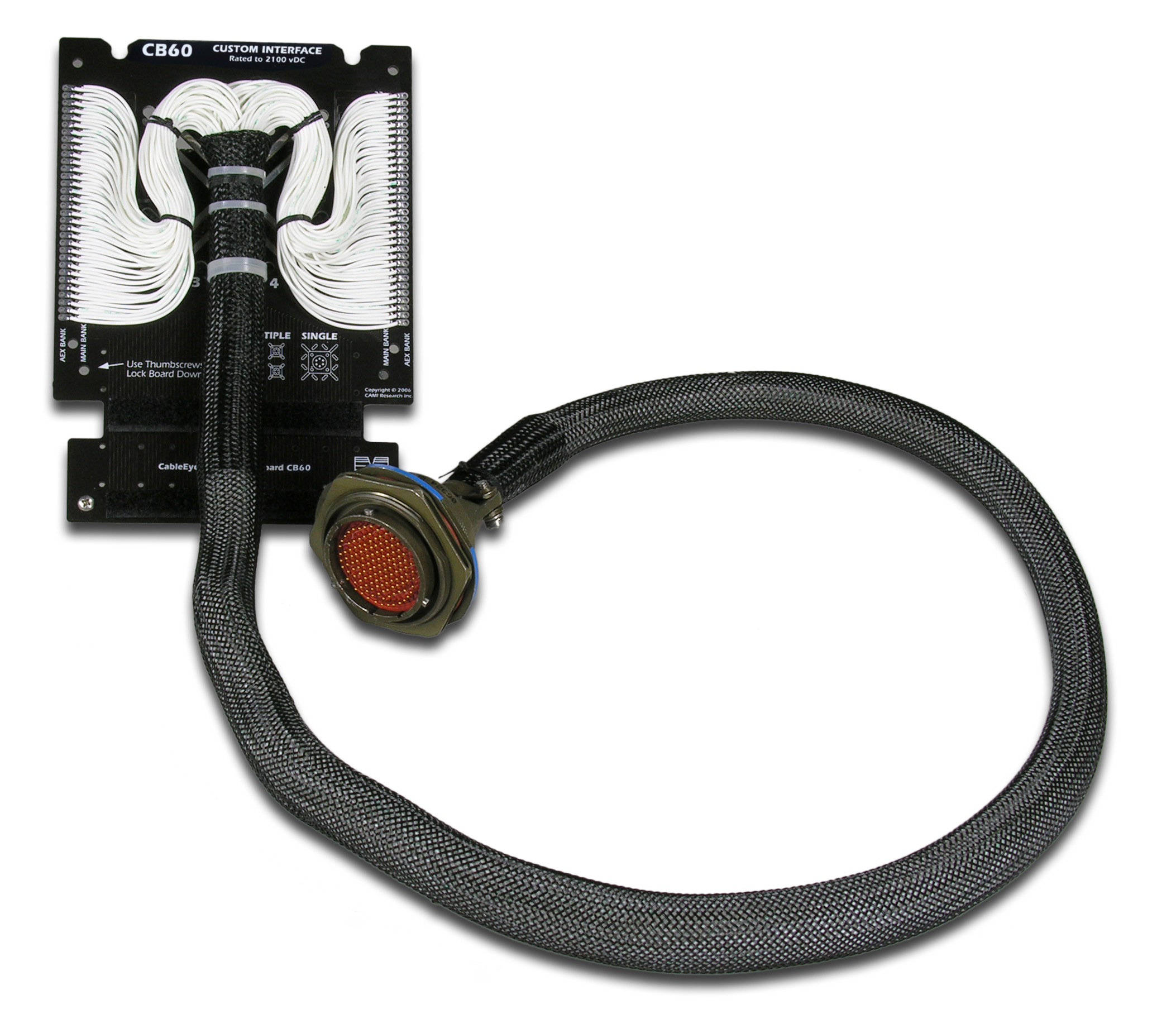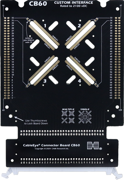 When the wiring is displayed, a generic dual-row header is shown for the connector. Use the optional PinMap™ fixture editor software (recommended for this board) to choose a better, connector-specific graphic from the CableEye connector library, and to assign custom pin labels. To create a graphic not yet in the connector library, use the Connector Designer ™ connector editor software. Use two CB60 boards together, or a CB60 in combination with any other CB board to accept any connector combination. Review the photos below for the setup options, or click to see photos of custom applications.