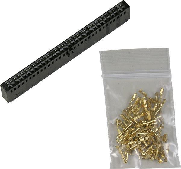 Consists of a 64-pin socket body with open cavities and a kit of 65 gold-plated female crimp pins (64 plus 1 extra) for 22-26 gauge wire. When assembled, this socket plugs into any of the 64-pins headers used on CableEye testers or expansion modules and would be employed when building rugged custom interfaces where IDC flat cable would be inappropriate, or where test voltages up to 2100 Vdc or 1200 Vac. must be sustained. Crimp pins suitable for other gauge sizes or with different plating are available; contact us for information. Note: appropriate crimping tool required!