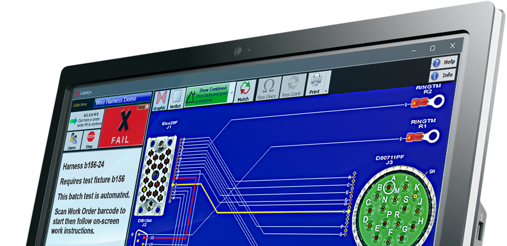 Customizable Display. You can configure the arrangement and orientation of connectors for graphical display on a per cable/harness basis. You can re-arrange and save connector placement in graphics mode. When you reload the cable or harness data as Match Data, the connector placement is remembered and restored. Furthermore, when you you acquire a new wiring sample from the CableEye tester, the Test Data information is displayed in the same form.