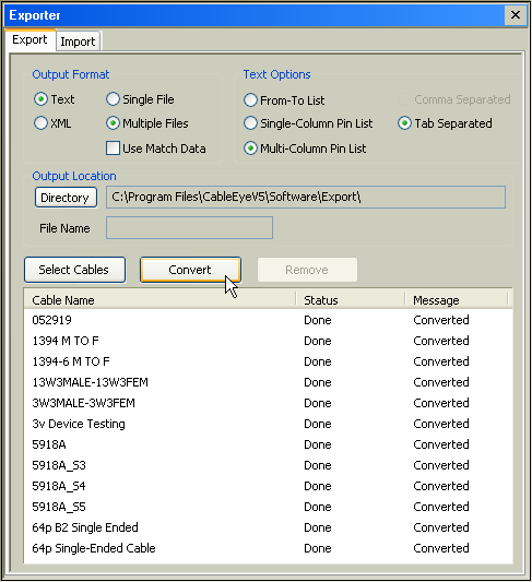 Export creates a comma- or tab-delimited ASCII file (or XML-format file if you prefer) containing a wire list, connector names, and descriptive notes for each cable in your database. Import reverses the process by taking appropriately formatted data that you have edited, or created, and translates it into the CableEye database format. Graphic images are not exported or imported. Use a screen capture program to create .bmp files for graphic wiring diagrams.