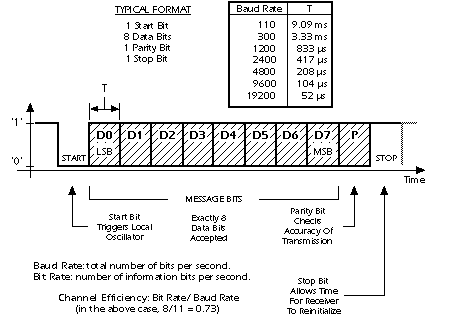 The baud rate refers to the signalling rate at which data is sent through a channel and is measured in electrical transitions per second. In the EIA232 serial interface standard, one signal transition, at most, occurs per bit, and the baud rate and bit rate are identical. In this case, a rate of 9600 baud corresponds to a transfer of 9,600 data bits per second with a bit period of 104 microseconds (1/9600 sec.). If two electrical transitions were required for each bit, as is the case in non-return-to-zero coding, then at a rate of 9600 baud, only 4800 bits per second could be conveyed. The channel efficiency is the number of bits of useful information passed through the channel per second. It does not include framing, formatting, and error detecting bits that may be added to the information bits before a message is transmitted, and will always be less than one.
