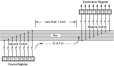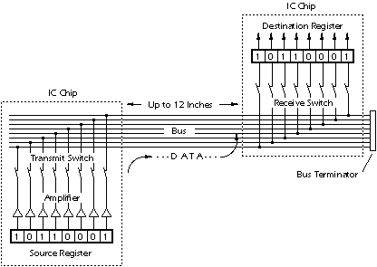 When the source and destination registers are part of an integrated circuit (within a microprocessor chip, for example), they are extremely close (thousandths of an inch). Consequently, the bus signals are at very low power levels, may traverse a distance in very little time, and are not very susceptible to external noise and distortion. This is the ideal environment for digital communications. However, it is not yet possible to integrate all the necessary circuitry for a computer (i.e., CPU, memory, disk control, video and display drivers, etc.) on a single chip. When data is sent off-chip to another integrated circuit, the bus signals must be amplified and conductors extended out of the chip through external pins. Amplifiers may be added to the source register: