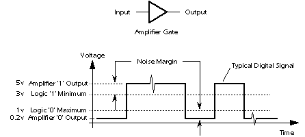 Special amplifier circuits are designed for transmitting direct (unmodulated) digital signals through cables. For the relatively short distances between components on a printed circuit board or along a computer backplane, the amplifiers are in simple IC chips that operate from standard +5v power. The normal output voltage from the amplifier for logic '1' is slightly higher than the minimum needed to pass the logic '1' threshold. Correspondingly for logic '0', it is slightly lower. The difference between the actual output voltage and the threshold value is referred to as the noise margin, and represents the amount of noise voltage that can be added to the signal without creating an error: