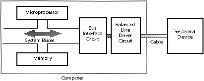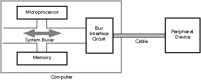 Computer peripherals such as a printer or scanner generally include mechanisms that cannot be situated within the computer itself. Our first thought might be just to extend the computer's internal buses with a cable of sufficient length to reach the peripheral. Doing so, however, would expose all bus transactions to external noise and distortion even though only a very small percentage of these transactions concern the distant peripheral to which the bus is connected.