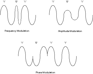 Transmission of data from your personal computer to a timesharing service over phone lines requires that data signals be converted to audible tones by a modem. An audio sine wave carrier is used, and, depending on the baud rate and protocol, will encode data by varying the frequency, phase, or amplitude of the carrier. The receiver's modem accepts the modulated sine wave and extracts the digital data from it. Several modulation techniques typically used in encoding digital data for analog transmission are shown below: