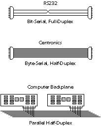 Byte-serial transmission conveys eight bits at a time through eight parallel channels. Although the raw transfer rate is eight times faster than in bit-serial transmission, eight channels are needed, and the cost may be as much as eight times higher to transmit the message. When distances are short, it may nonetheless be both feasible and economic to use parallel channels in return for high data rates. The popular Centronics printer interface is a case where byte-serial transmission is used. As another example, it is common practice to use a 16-bit-wide data bus to transfer data between a microprocessor and memory chips; this provides the equivalent of 16 parallel channels. On the other hand, when communicating with a timesharing system over a modem, only a single channel is available, and bit-serial transmission is required. This figure illustrates these ideas: